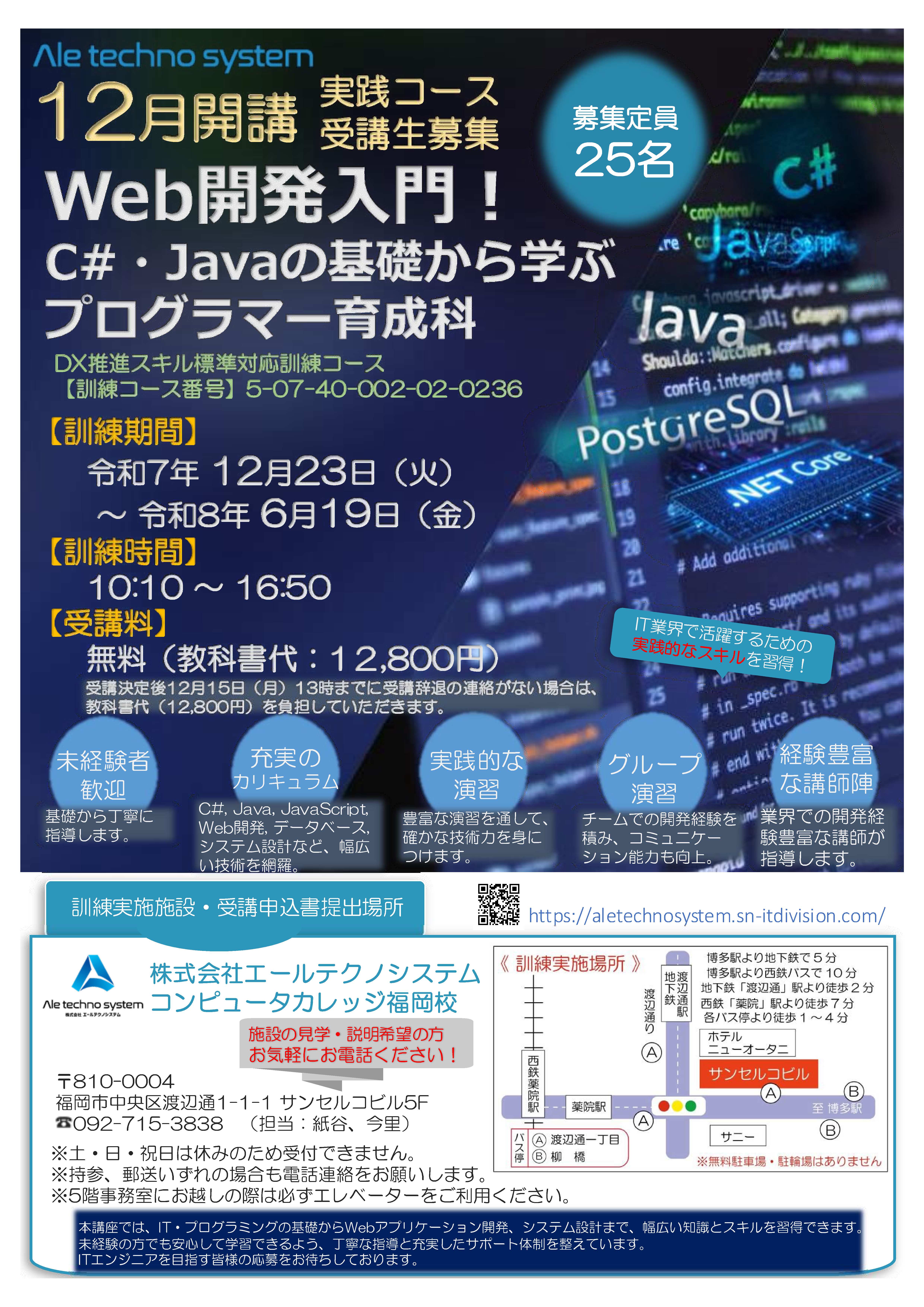 C#、Java、データベース、JavaScriptの基本的な知識や技術を習得できます。