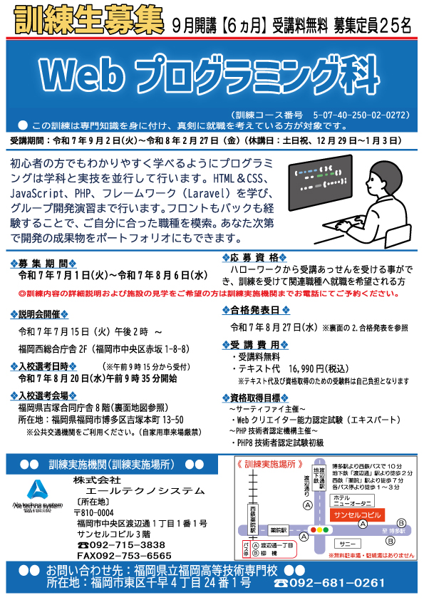 弊社は公的職業訓練実施校です。公的職業訓練を受講することで、ご希望の分野において「技能の習得」「資格の取得」等を図った上で、訓練実施施設及びハローワークで「就職活動のサポート」を受けることができます。